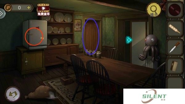 8、玩家用三角形木块打开餐厅的冰箱,然后可以拿到钥匙,使用钥匙打开地下室门。