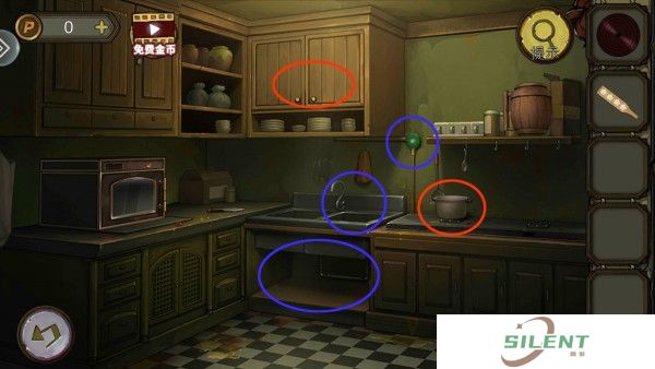 9、玩家到地下室后先点镜子,可以拿到黑布,玩家用黑布到厨房水龙头浸湿,擦镜子。